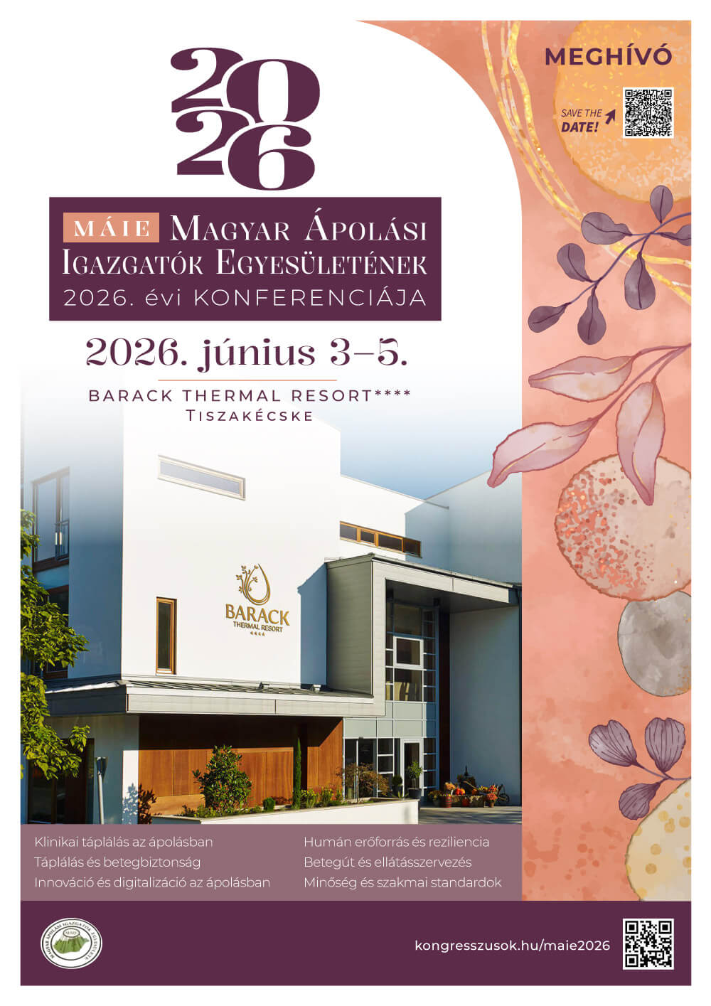 A Magyar Ápolási Igazgatók Egyesülete 2026. évi konferenciája 2026. június 3–5. között kerül megrendezésre a tiszakécskei Barack Thermal Resortban.